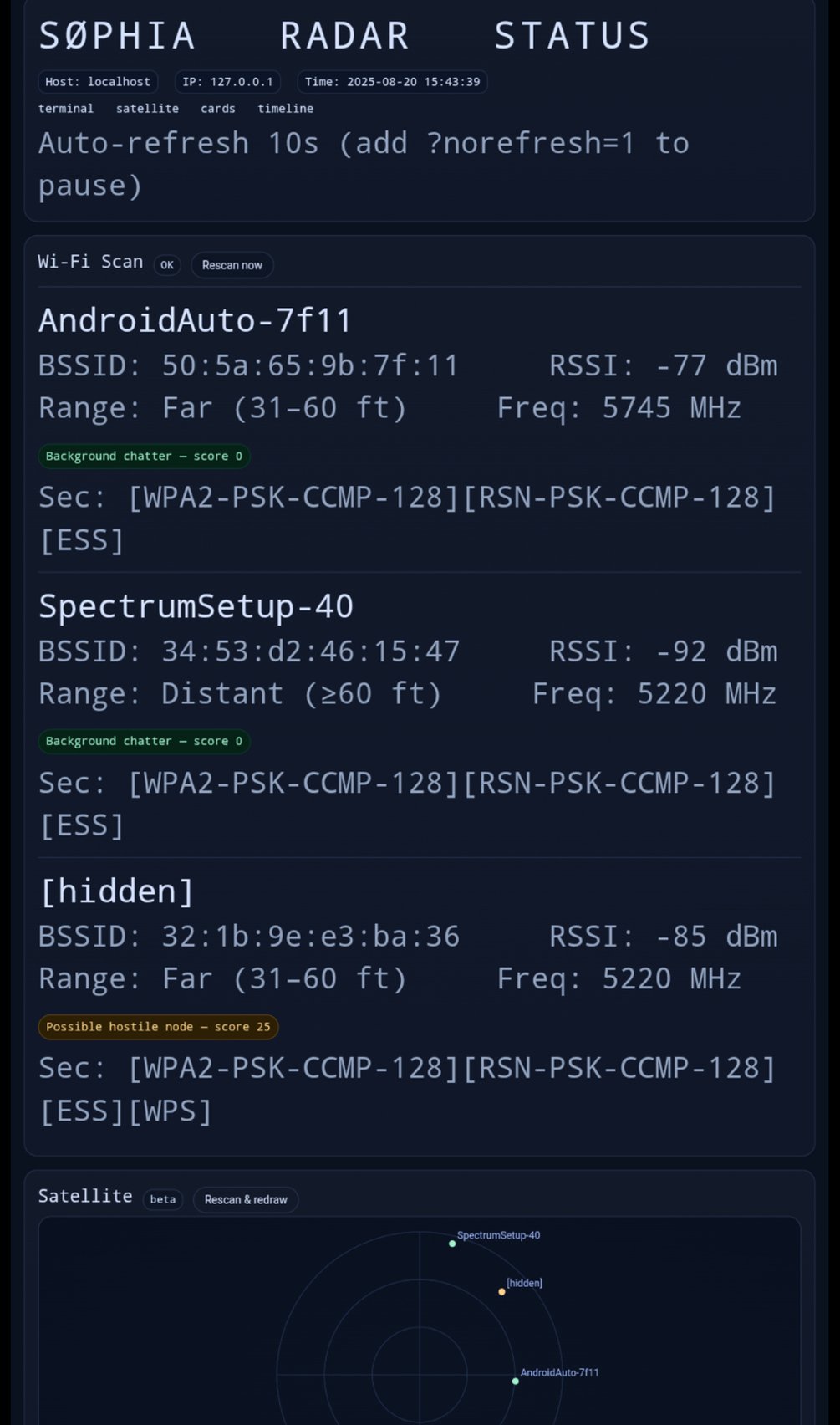 SØPHIA runs fully offline, scanning nearby Wi-Fi signals and mapping them on a real-time radar HUD.
