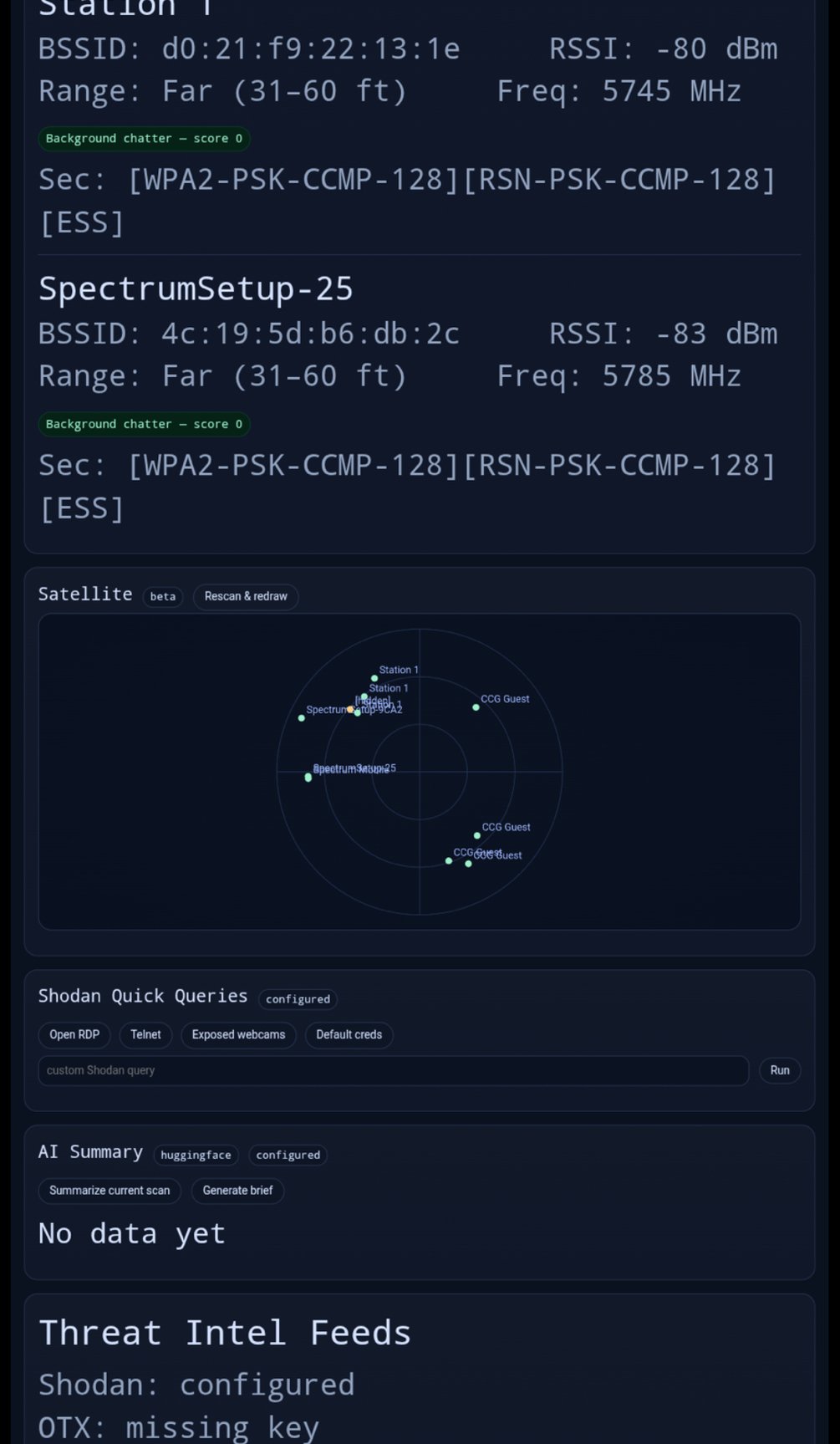 - Live Wi-Fi scanning with distance estimation + risk scoring
